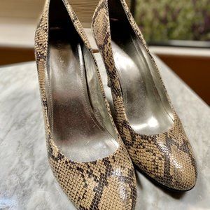 Snakeskin print shoes, more taupe/grey in colour. 4" heel. Condition: used.