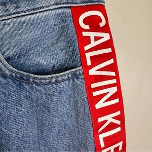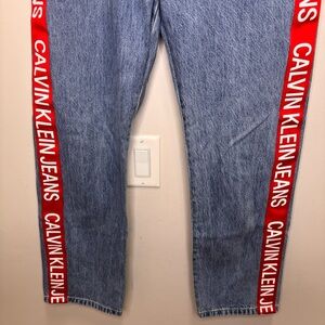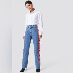 These jeans by Calvin Klein are straight and feature a high rise waist, a brand logo down the sides and a 5-pocket design.