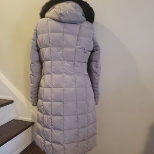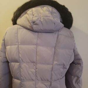 This long duck down blend jacket with a faux fur trimmed hood has layered zip and button closure insulation for optimal warmth in cold weather settings. Funnel neck, Long sleeves, Removable faux fur trim hood with drawstring, Front zip closure, Layered snap button closure, Two front zip pockets, Insulated Lined. Overall preowned condition is good except for two minor flaws declared in last two pictures. Please make me a reasonable offer if you are interested.