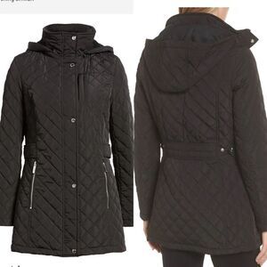 A warm quilted jacket is extra-cozy topped with a soft rib-knit panel at the tall stand collar and a plush, brushed lining at the hood. Side button-tabs and elastic at the back waist refine the silhouette.