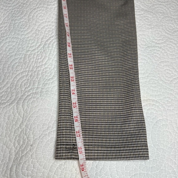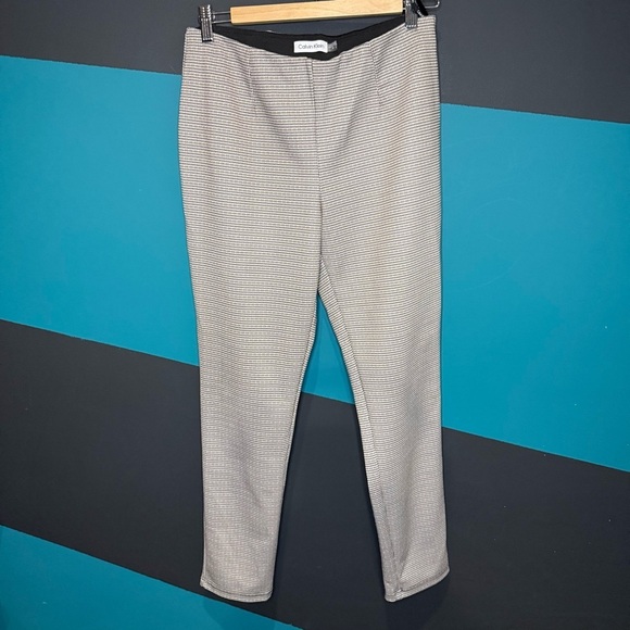 Elegant Calvin Klein trousers with a classic houndstooth pattern. Features black and white design.