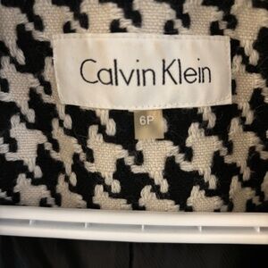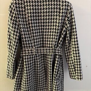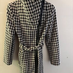 Houndstooth printed jacket with 2 fairly large pockets. Zipper closure with waist tie and faux leather accents. Lightly worn and dry clean only
