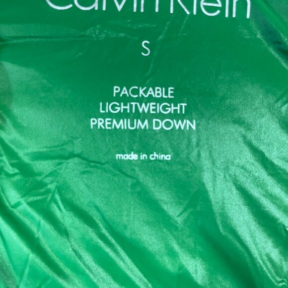 Visible markings/tags: Interior print shows "Calvin Klein," size "S," and "PACKABLE LIGHTWEIGHT PREMIUM DOWN"; code "CA 07043" visible