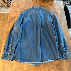 Light blue, denim style cotton button-up shirt, worn but good condition.
