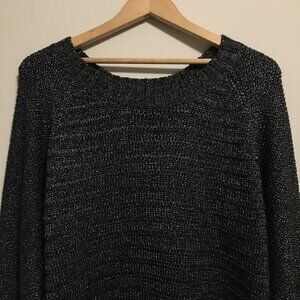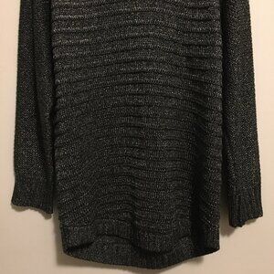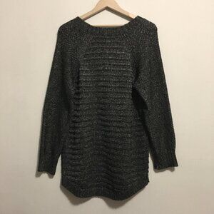 Very good preowned condition, charcoal coloured, almost black, horizontally varied knit, crewneck shaker sweater with silvery threads integrated throughout. Hem is slightly longer in the back.