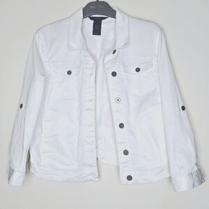 Stylish white jean jacket. Features vibrant pink floral embroidery on the back. Perfect for casual outings.