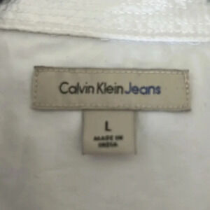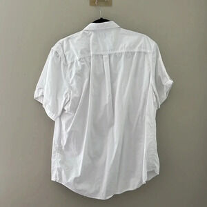 A classic white short sleeve button-up shirt from Calvin Klein Jeans. Features two chest pockets and a crisp, clean design suitable for casual or semi-formal occasions. It is in great condition sized large pit to pit is 21 5/8 inches top to bottom is 29 inches