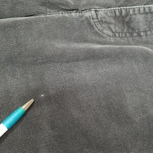 They have a couple small spots on the front and some wear on the bottom back pant leg, see pictures, in good condition