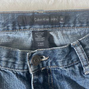 Calvin Klein Jeans, medium/dark wash with no fading. Can be worn high or low waisted depending on your preference.