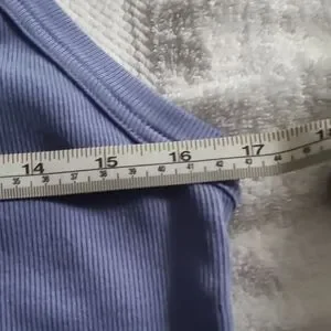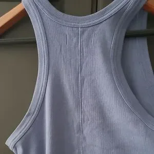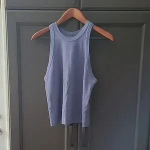 Chic periwinkle blue tank top by Calvin Klein. Features ribbed texture and sleeveless design. Very cute for layering or wearing alone. Has a small CK embroidered on the bottom left of the top.
