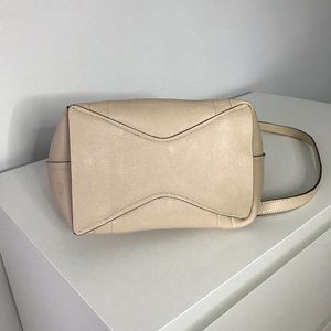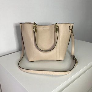 CK Shoulder/Tote Bag. Light nude colour on the outside and blush pink on the inside. Vegan leather with gold hardware. Comes with blush pink Pouchette. Has adjustable crossbody strap and can be removed to use bag as a tote. Magnetic enclosure. Has 2 side pockets on the inside. 14.5"L x 9"H x 6.5"D. Longest length of strap is 48.5". Overall in great condition. Used several times. Has some minor glue stains on bottom side which was there when purchased but hardly noticeable. Might be able to remove with oil based skin cleanser or Goo Gone Spray.