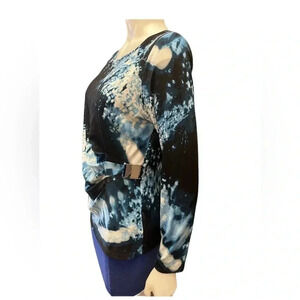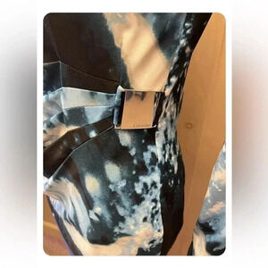 Calvin Klein printed long sleeve dress top wrap style with silver buckle at waist. A mix of blues and white. Watercolour print. Rounded neckline, lots of stretch!