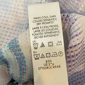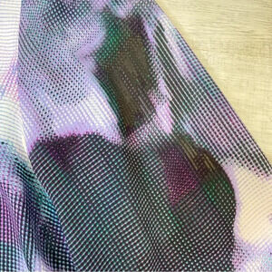 Note the print has a pixelated pattern with assorted colors like black, green, purple and there are patches of black that on first glance look like a stain but this color variation appears throughout the pattern in different shades and sizes. Please see photos for close ups
