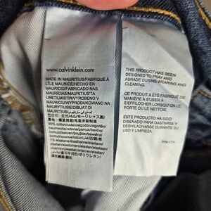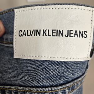 These Calvin Klein skinny jeans in a classic blue hue feature a stylish distressed design, offering a modern and casual look. The denim's subtle fading and distressing add character, making them perfect for everyday wear. Inseam 29" rise 11" Waist 29"