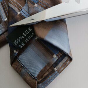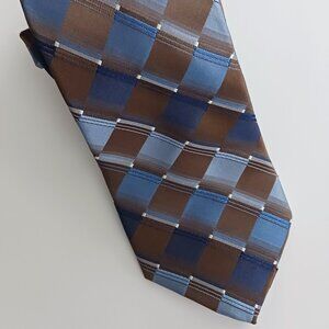 New With Tag: Calvin Klein Men's Necktie, where Brown and Silver Blue geometric squares create an abstract, preppy pattern perfect for any wardrobe.