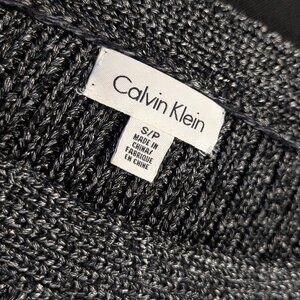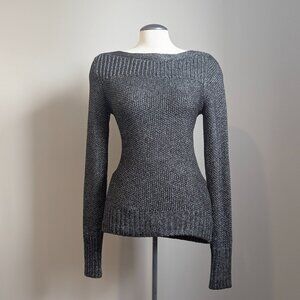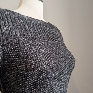 Calvin Klein, black, silver, metallic sweater, knit sweater, side zip detail, boat neck, ribbed knit, contemporary brand, size small, petite, dark, Medieval, holiday, new years eve, aesthetic, monochrome, layering piece, textured knit, minimal, architectural, Night Range, future goth, high desert, designer, luxury knitwear, pullover, evening wear, gothic elegance, sophisticated, timeless, unique