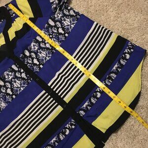 Very good preowned condition, semi sheer modern, colour block printed chiffon top with eclectic geometric and damask pattern in black, blue, yellow and white top by Calvin Klein. If interested in a camisole, please let me know and I can try to accomodate.