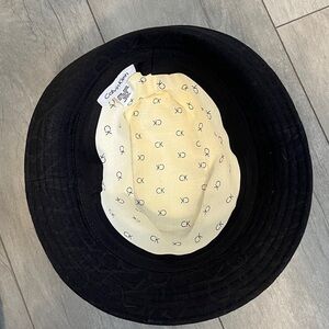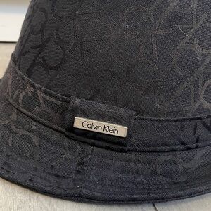 Chic black monograph fedora hat by Calvin Klein. Ideal for casual wear. New condition never worn. Polyester cotton blend fabric. Made in Taiwan. One size