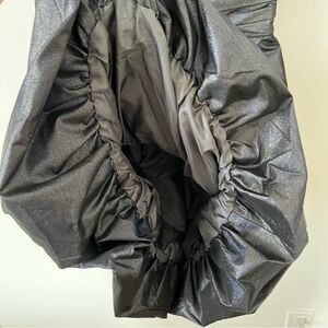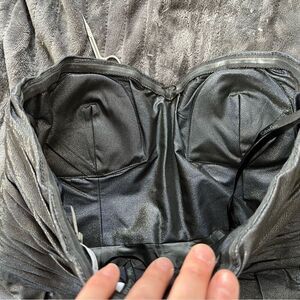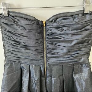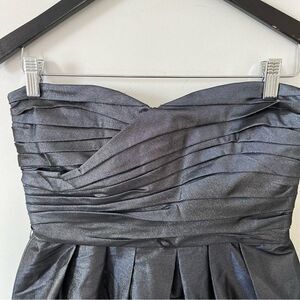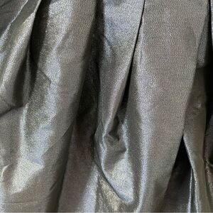 Shimmery navy & gold fabric sparkles when it moves. Bubble skirt creates a unique fit. Sweetheart neckline and bust is cross cross layered fabric. Build in bra with boning and lined with rubber to help the dress stay put. Beautiful construction. Exposed bronze zipper down the back.
