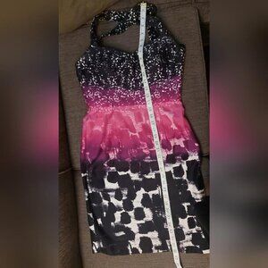 Calvin Klein cross back strap dress featuring a bold ombre gradient design, fitted silhouette, and a sleek abstract print. This sophisticated yet eye-catching dress is perfect for cocktail parties, formal events, and date nights.