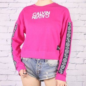 This slight crop pullover has a crewneck and a trendy black logo design down the arms. This is a great top to wear casually or while working out.