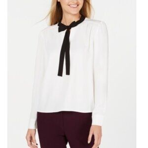 A contrast tie at the neckline gives a polished finish to this sophisticated petite top from Calvin Klein, finished with long cuffed sleeves.
