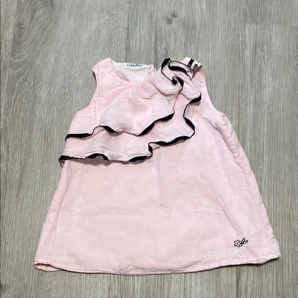 Adorable pink ruffle top by Calvin Klein. Features a stylish black trim.