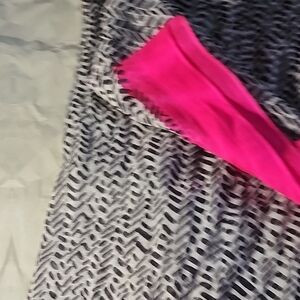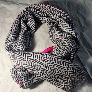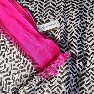 Stylish Calvin Klein scarf. Features bold pink edges. Black and white geometric pattern. Perfect for any outfit.