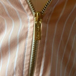This elegant blouse features a fitted silhouette with a classic dress shirt collar, crafted in a delicate pink and white color scheme. The long sleeves and zipper style make it a versatile addition to any wardrobe, perfect for both professional and casual settings. Size XS, 45 cm pit to pit, 70 cm length