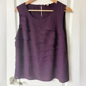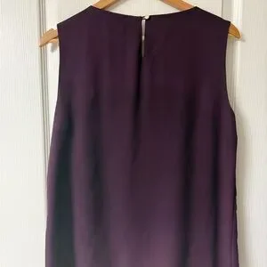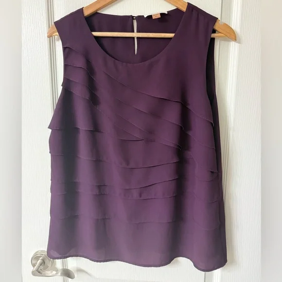Calvin Klein sleeveless blouse in a rich plum/burgundy shade with elegant layered ruffle detail.
