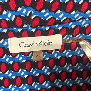 Stylish dress with a vibrant blue and red pattern. Features a drawstring detail.