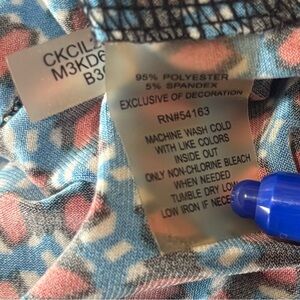 Stylish dress with a vibrant blue and red pattern. Features a drawstring detail.