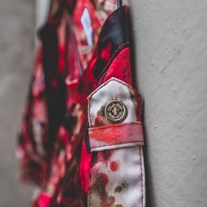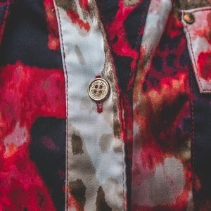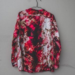 Polyester/Spandex bright pink printed blouse with gold embossed buttons. Shoulder tab detail with gold buttons.