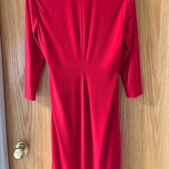 CALVIN KLEIN. Red dress, lined, with shirring on right and left side. Contoured Centre back seam for perfect fit. This dress has 3/4 length sleeves. Worn twice. Size 12. Like brand new.