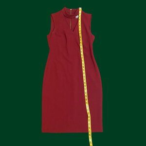 Command attention with timeless elegance. This Calvin Klein sleeveless sheath dress combines sophisticated tailoring with modern detailing, making it a versatile piece for work events, cocktail parties, or holiday gatherings. The rich wine-red hue flatters every skin tone, while the mock neckline with keyhole cutout adds a subtle yet stylish touch.