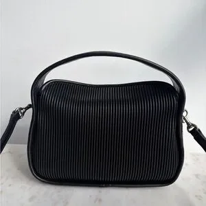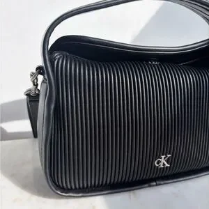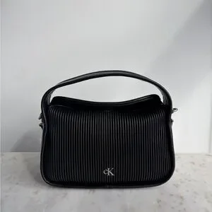 Sleek black design with ribbed texture. Features Calvin Klein logo. Ideal for versatile styling.