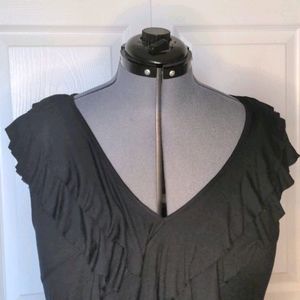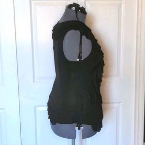 Black ruffled tank top, made from stretchy knit t-shirt fabric.