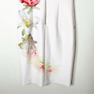 This dress is a Calvin Klein white floral print scuba sheath dress featuring a sleeveless, knee-length design with a back zipper. The vibrant floral print includes large-scale peonies, lilies, and orchids. It is a popular style known for its flattering fit and structured scuba material.