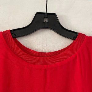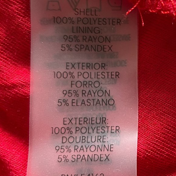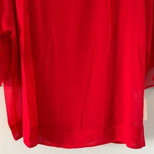 Size: Medium. Color: Cherry Red. Shell: 100% polyester. Lining: 95% rayon; 5% spandex. Length: 25 inches. Chest: 36 inches. Waist: 38 inches. Sleeveless tank lining. Sheer overlay. Ruffled sleeve hems. Retails for $99 USD (plus tax). Excellent condition! New with tags.
