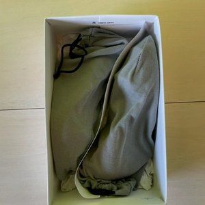 Calvin Klein silver heels with silver "plate" embellishment on the toe. 3 1/4 inch heel. Gently worn. Still in original box with shoe cover bags included.
