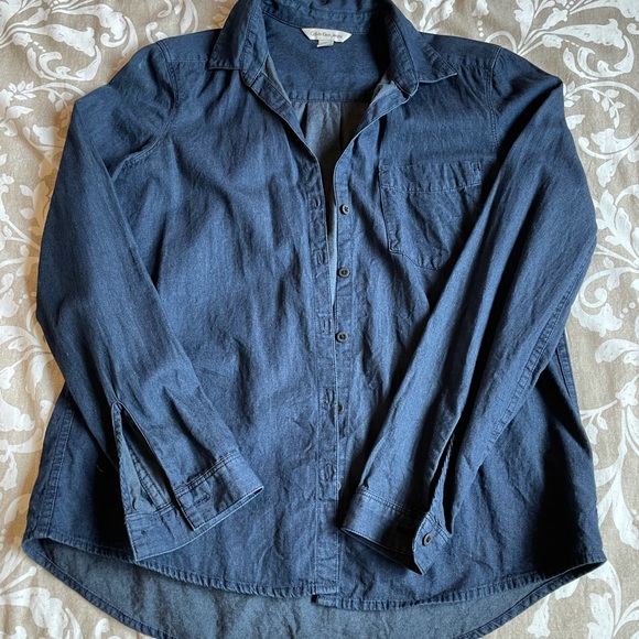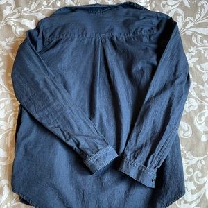 Great condition. A little shorter in the front than the back. Lightweight denim. Black buttons along the front and on sleeve cuff. Size XS Women’s