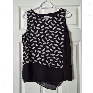 Worn a few times, and it has been well-maintained. The material is a lightweight, sleeveless top with a black and white pattern and an asymmetrical hemline. The top has a black chiffon layer at the bottom.
