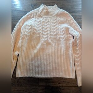 Elegant light pink sweater with cable knit design. Soft and warm for any occasion. The color is a bit more pink than the photos show.