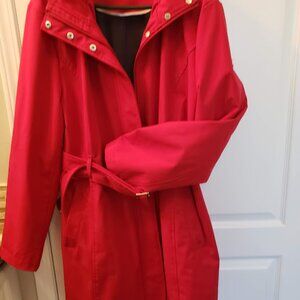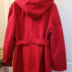 Calvin Klein Car length Trench Coat is great for spring and fall jacket Or if purchased a bit large which I did it can be worn with a hoodie or warm sweater for colder weather wear. Worn twice, this great little coat is in great condition but has a tiny mark on the hood which i have shown a close up of. Wear it with or without the hood, add a scarf & or broch.