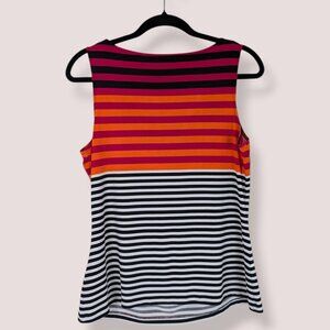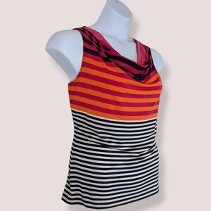 This sleeveless top by Calvin Klein is made of a polyester/spandex blend (95/5) and has a nice stretch in the fabric. The top has black and white stripes on the bottom, pink and orange stripes at the top, and pink and black stripes around the very top and cowl neck. The top has normal wear but nothing that affects wearability.