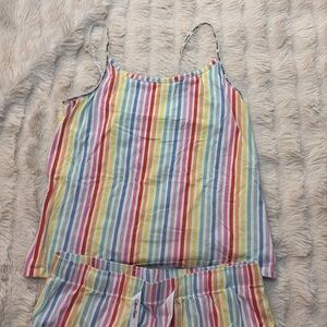 Add a cheerful touch to your nighttime routine with this Calvin Klein striped pajama set, Size M, in great condition. Featuring a cami-style top with adjustable spaghetti straps and drawstring shorts, this set is crafted from lightweight breathable cotton—perfect for warm nights or lounging in style.