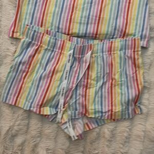 The vibrant rainbow stripe pattern brings a playful vibe to your sleepwear rotation, while the relaxed fit ensures all-night comfort. Whether you’re packing for a weekend getaway or upgrading your self-care wardrobe, this set delivers vacay vibes and effortless charm.