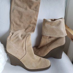 CALVIN KLEIN SOLEDAD SUEDE BOOTS BEIGE TALL WEDGE FASHION KNEE-HIGH.