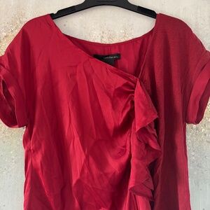 Asymmetrical neckline. Ruffle detailing on front left side. Short sleeves. Retails for $ 85 CAD (plus tax). Excellent condition! New without tags.