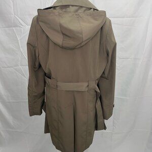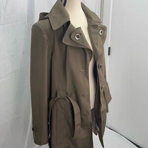 ABOUT: Stylish Greenish Calvin Klein jacket with hood to be worn outdoor during rain. Trendy fit in large size. Multiple options to style with with other outfits.